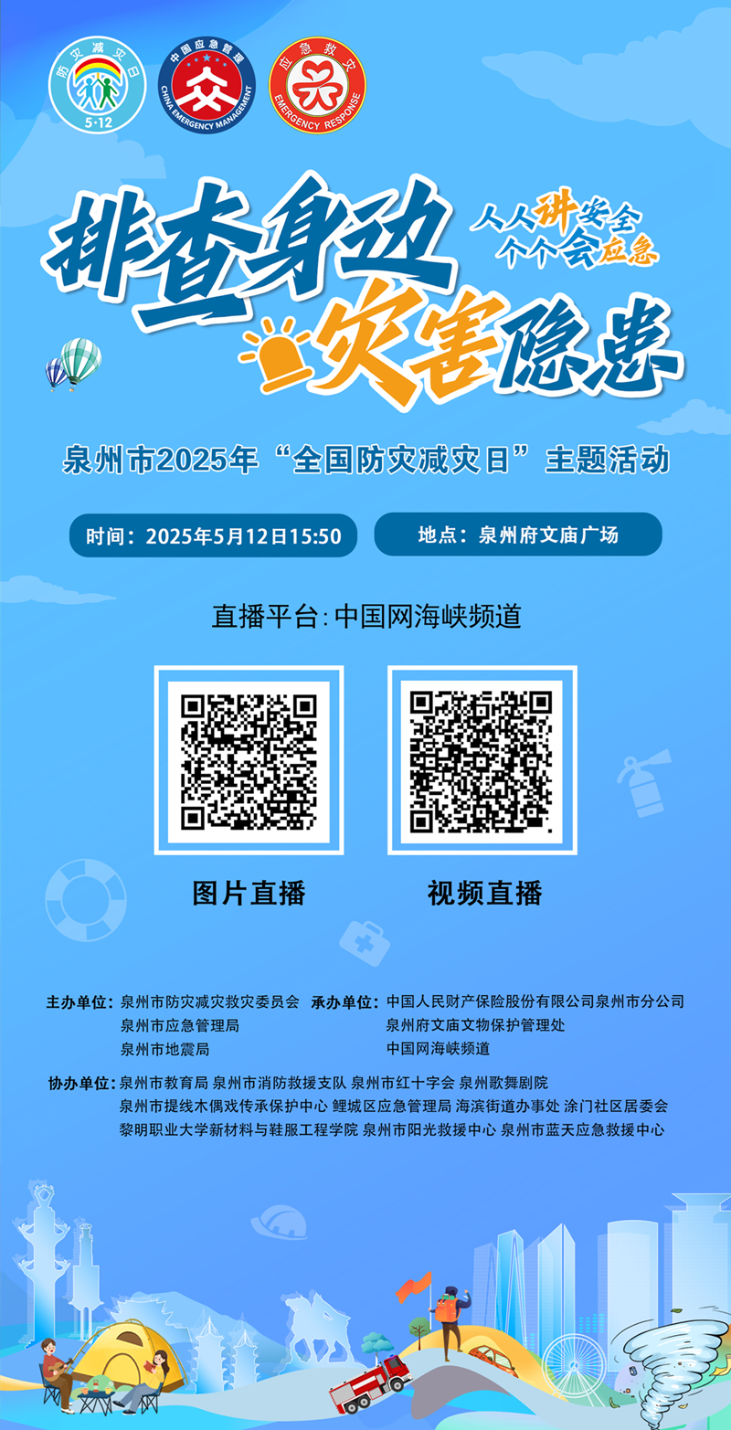 今年5月12日是我国第17个全国防灾减灾日,主题是“人人讲安全、个个会应急——排查身边灾害隐患”,5月12日至18日为防灾减灾宣传周。为深入贯彻落实习近平总书记关于防灾减灾救灾重要论述指示批示精神和党中央、国务院、省委省政府以及市委市政府决策部署,泉州市“全国防灾减灾日”主题活动将于5月12日15:30举办,届时现场直播会同步进行,欢迎广大市民群众共同参与!