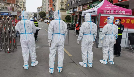 我们34位同志分成六组,主要负责协助社区做好单元楼栋封控、片区管控等工作各组根据分工内容,逐户上门登记信息、分发自测试剂、环境消毒消杀、转送生活物资,期间除了中途停下来简单吃下便餐补充能量外,不敢喝水、不敢上厕所,从上午忙碌到晚上十一点,筋疲力尽,但精神异常充实。