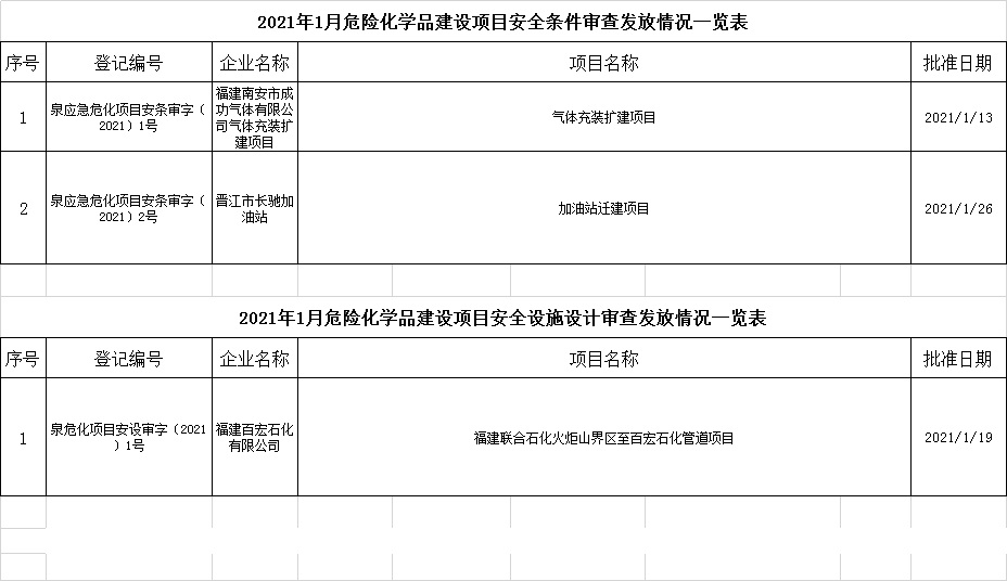 2021年1月份危险化学品建设项目安全条件及设施设计审查发放表