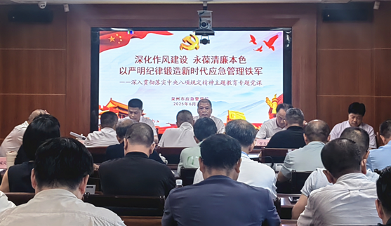在庆祝中国共产党成立104周年之际,为贯彻落实全面从严治党要求,扎实推进深入贯彻中央八项规定精神学习教育,2025年6月30日,泉州市应急管理局组织全体党员干部开展专题党课教育活动。局党委书记、局长以“深化作风建设,永葆清廉本色,以严明纪律锻造新时代应急管理铁军”为主题,从“深刻领悟精髓要义、清醒认识风险挑战、坚持严的主基调不动摇”等三方面给全体党员干部讲授了一场生动的专题党课。